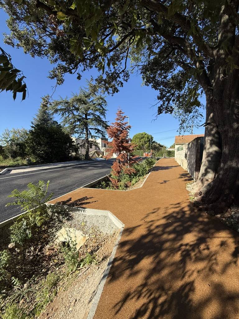 Pour les trottoirs, d’une surface de 200 m², nous avons utilisé deux enrobés différents : un enrobé noir 0/6 et un enrobé coloré ocre 0/6, pour un rendu esthétique et harmonieux avec l’environnement.