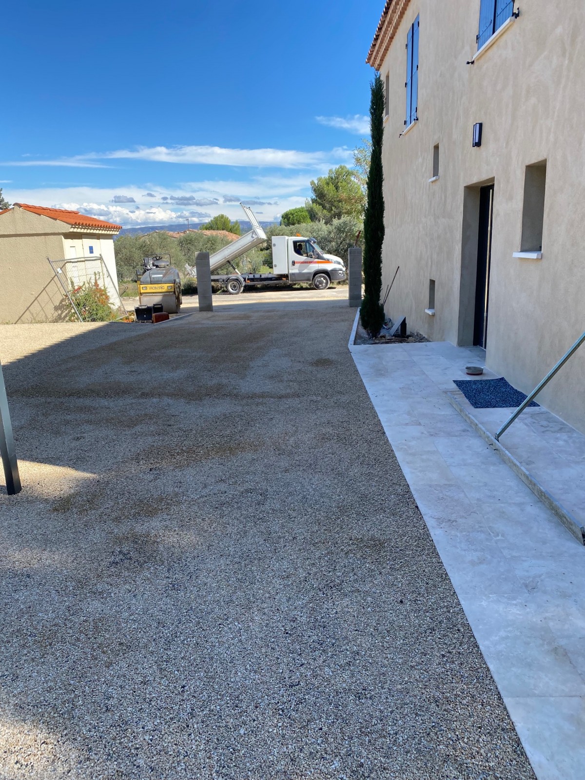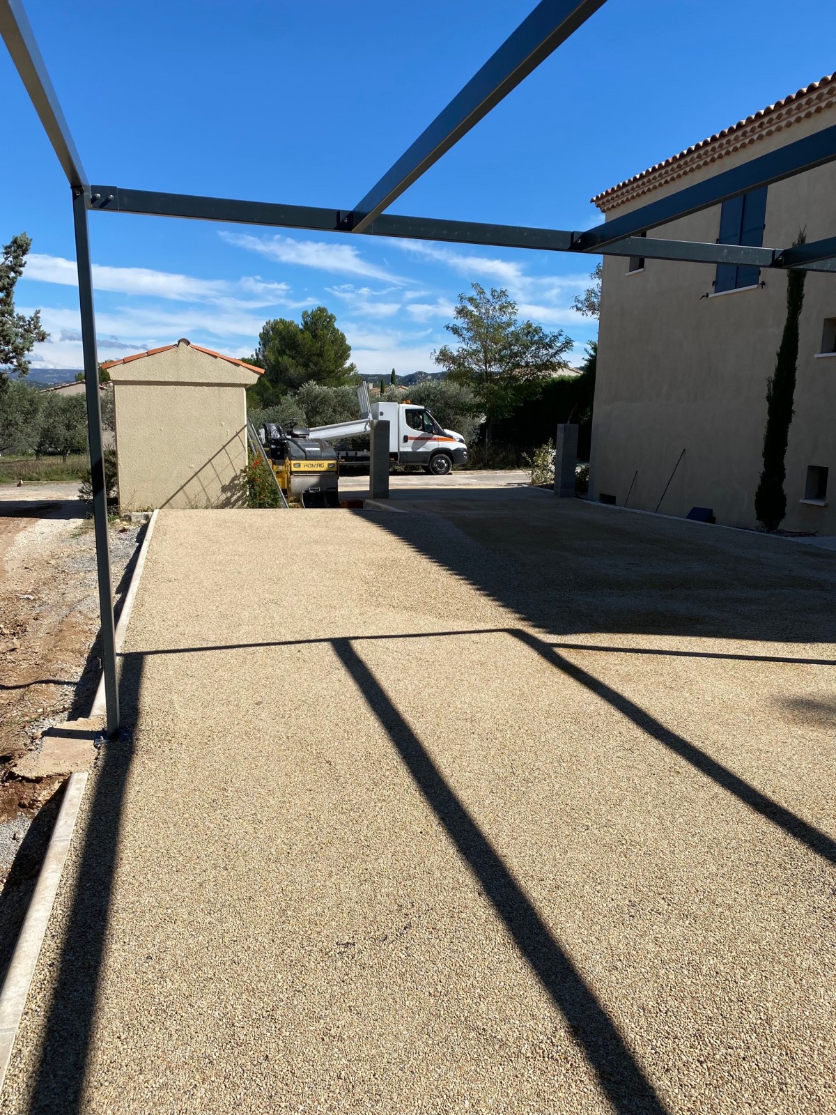 Enrobé Paca a réalisé un accès villa à Eygalières (13) avec un revêtement tricouche, complété par une finition en gravier coloré jaune. Le système tricouche consiste en l'application de trois couches successives de gravier lavé et d'émulsion de bitume à 65 %. La finition a été effectuée manuellement, avec un compactage soigné des abords et de l'ensemble, garantissant ainsi une finition durable et esthétique.