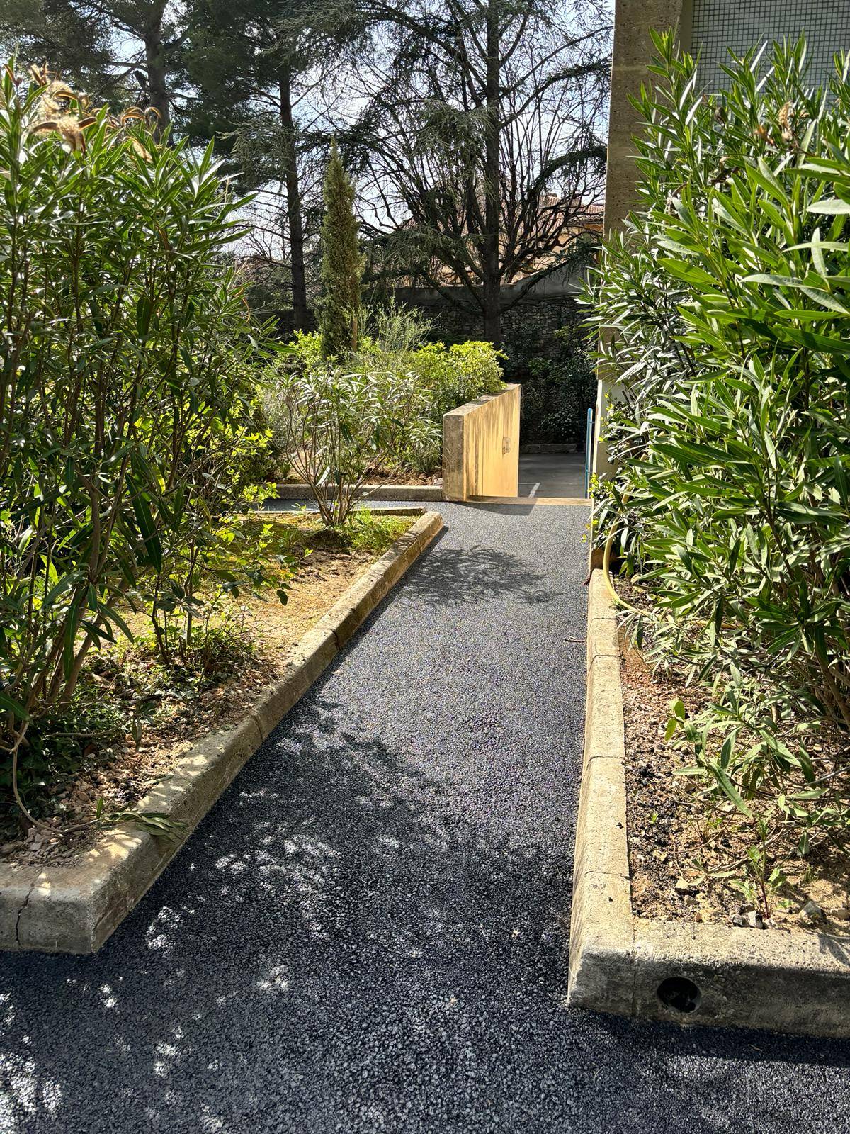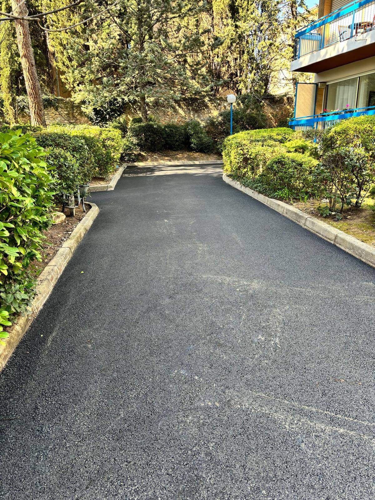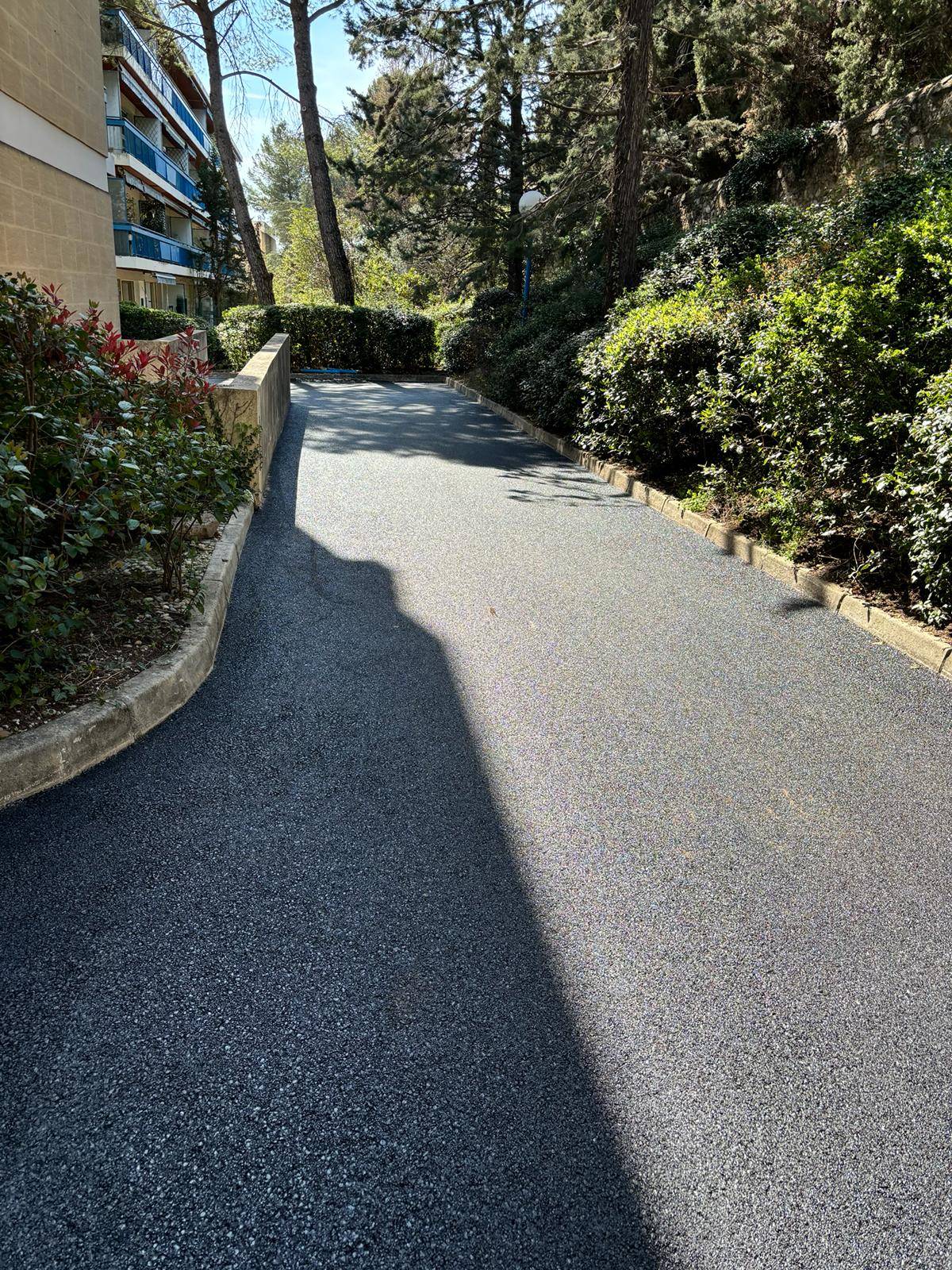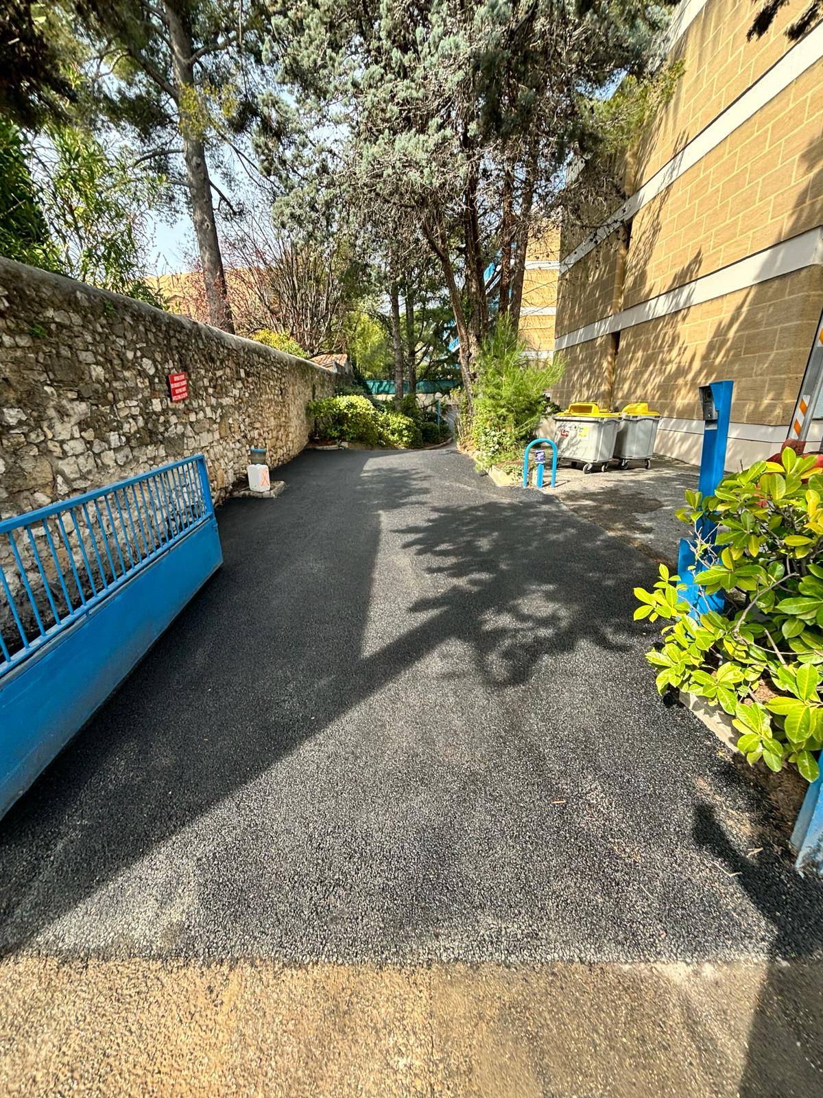 Nous avons également purgé les zones instables et repris le fond de forme. Cette étape est cruciale pour éviter tout affaissement futur du chemin, garantissant ainsi un passage sûr et résistant pour les habitants de cette résidence à Aix-en-Provence. Pour finir, un nivellement du support a été effectué, avant d'appliquer une couche d’enrobé noir 0/10 sur 5 cm d’épaisseur. Ce revêtement offre une finition esthétique et fonctionnelle pour une utilisation quotidienne.