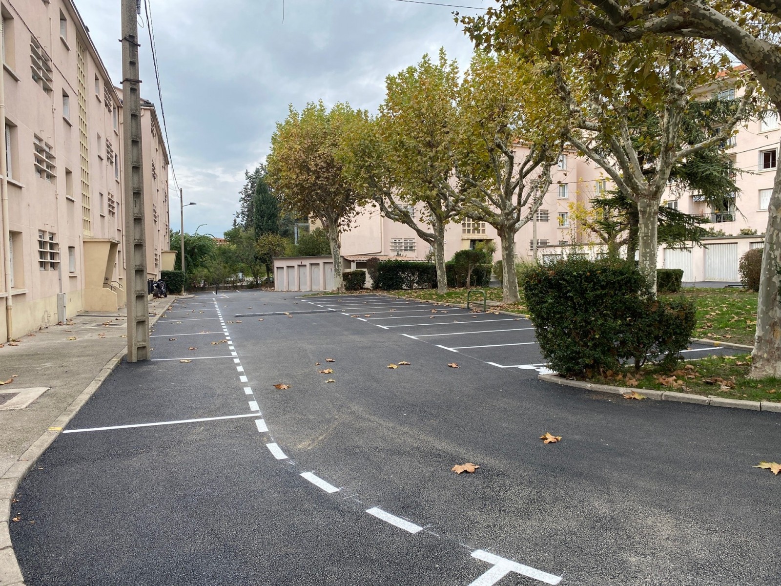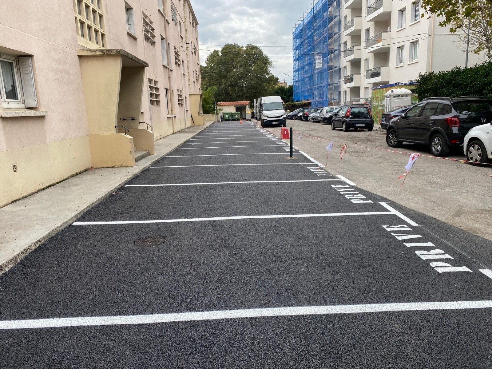Enrobé PACA a récemment réalisé la réfection complète des parkings et de la voirie d'une résidence privée près de Ventabren, Les Milles et Venelles. Notre équipe a pris en charge l'intégralité du projet, du décroutage à la préparation des sols. Nous avons appliqué un enrobé 0/10 noir sur 5 cm d'épaisseur, couvrant une surface totale de 1 200 m². Le marquage au sol des places de stationnement a également été effectué avec soin.