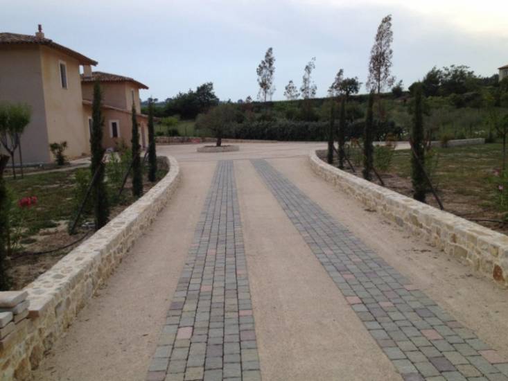 Enrobé Paca a réalisé le terrassement et la préparation du sol pour la création d'une entrée de villa ou d'une copropriété, suivis de la pose de pavés. Nous avons également appliqué de l'enrobé rouge et jaune pour une finition esthétique et durable.
